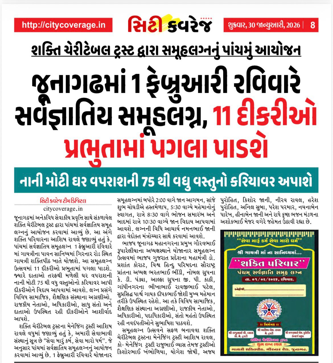 આજે શકિત ચેરીટેબલ ટ્રસ્ટ આયોજીત શકિત પરીવાર પ્રથમ સર્વજ્ઞાતિ સમુહલગ્નોત્સવ